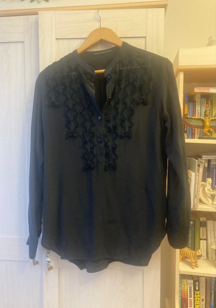 Siyah ipek kumaştan, uzun kollu, yaka detaylı ve önü nakışlı, düğmeli, bol kesim midi uzunlukta kadın gömlek. Gotik ve bohem tarzına uygundur.