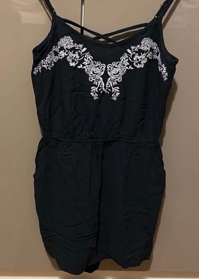 askılı tulum, beyaz işlemeli çiçek desenleri ve dantel detaylara sahiptir. Rahat kesimi ve midi boyu ile günlük kullanıma uygundur.