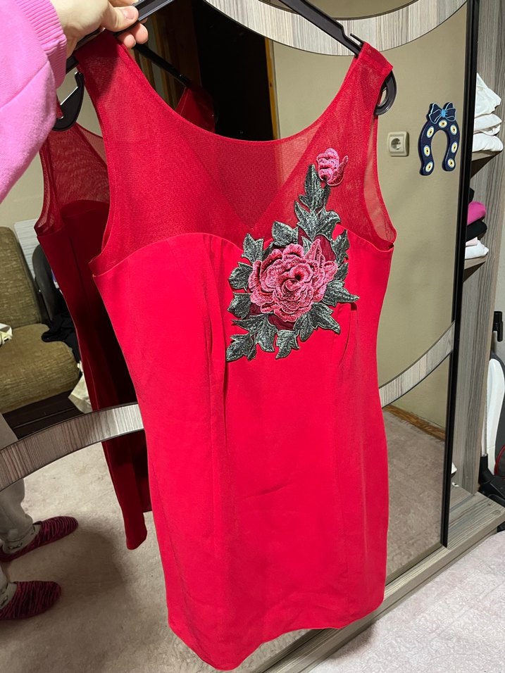 Kırmızı, dantel işlemeli çiçek detaylı, kolsuz ve vücuda oturan mini elbise. Romantik akşamlar için uygun.