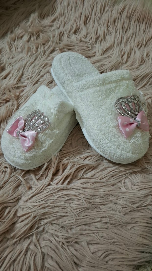 Yumuşak kumaştan, dantel detaylı beyaz terlikler, işlemeli desenler ve pembe fiyonk ile taşlı taç süslemeleri içerir. Klasik ve zarif tarz için uygundur. hiç kullanılmadı
