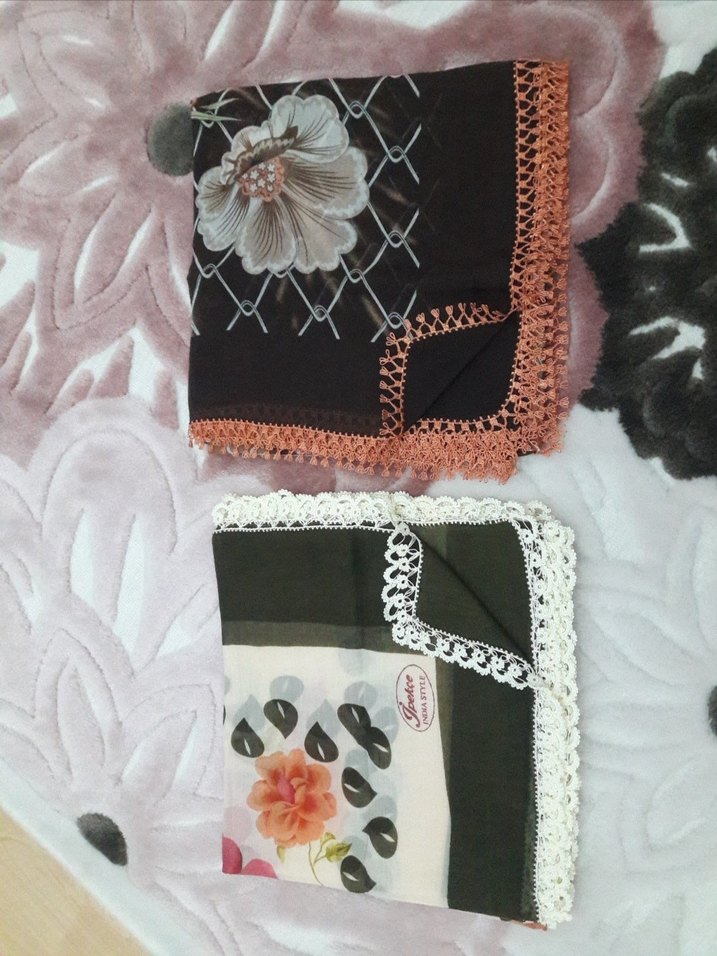 Dantel kenarlıklı, çiçek desenli koyu renkli iki adet kadın fular seti, rahat ve bohem tarzda.