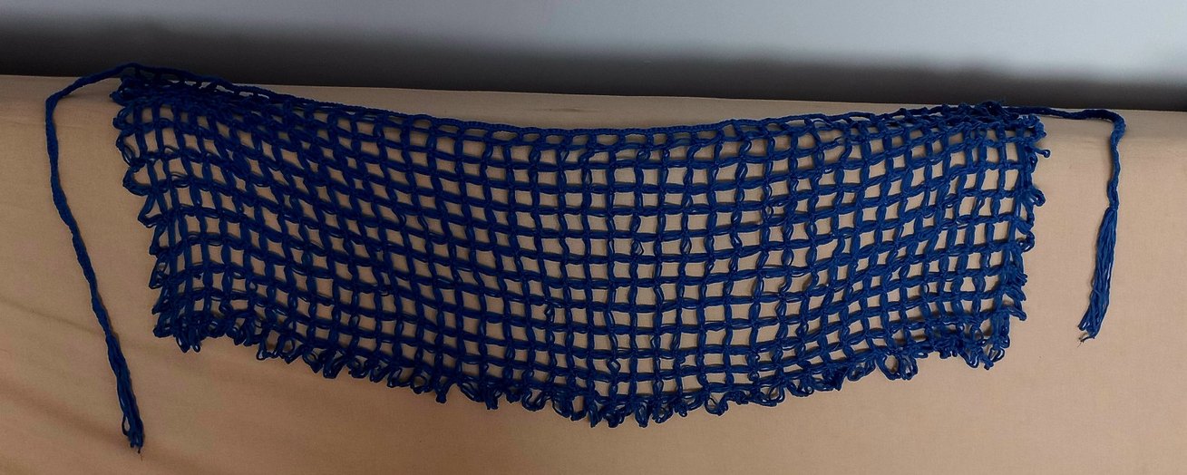 Kadınlar için koyu mavi rente örgüdür. Dantel detaylı pareo. Minimalist ve retro tarzda, bohem ve karşı kültür modasına uygundur. Kullanılmadı. Neredeyse 2 karış yüksekliktedir ve 4 karış eni vardır. Esnektir. S ve M bedene uygundur.