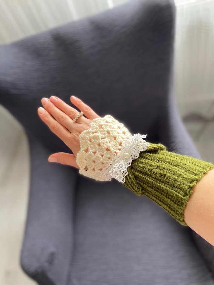 Kadınlar için örme eldiven, dantel detaylarıyla pastel beyaz ve yeşil tonlarında rahat bir bohem tarz sunar.