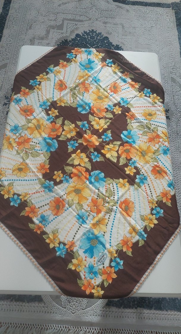 Sentetik kumaştan, koyu renkli çok renkli çiçek desenli ve dantel detaylı kadın tülbent