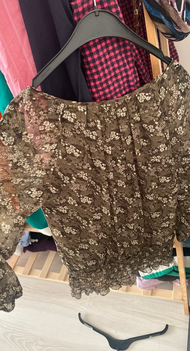Dantel detaylı, uzun kollu ve kayık yaka kahverengi desenli bluz. Bol kesim ve midi boyda, vintage bohem tarzını yansıtır.