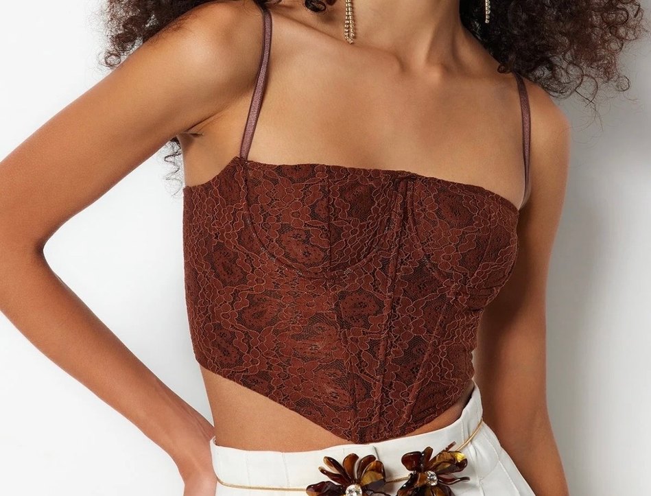 Dantel detaylı, kahverengi desenli, askılı bohem tarzda, vücuda oturan büstiyer. Romantik akşamlar için uygundur.