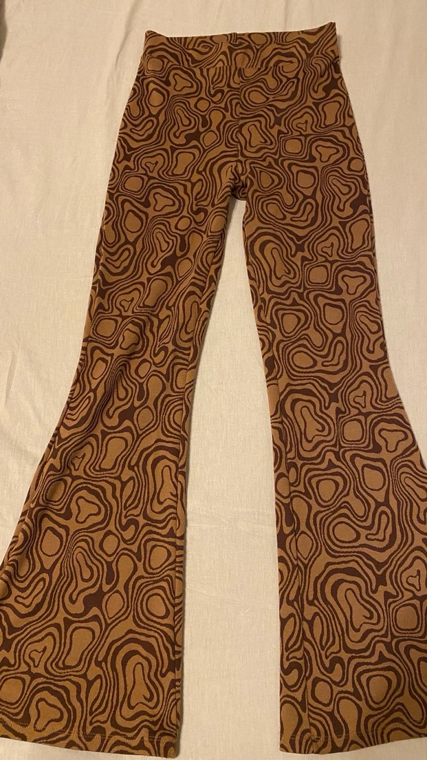 Kahverengi, koyu tie-dye desenli, dantel detaylı, bohem tarzda, midi boy, ispanyol paça pantolon. Yumuşak sentetik kumaştan, günlük kullanıma uygun.
