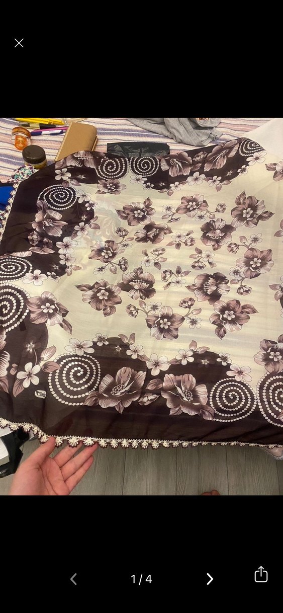 Kahverengi bohem tarzda kadın fular, dantel detaylı ve çiçek desenli, yumuşak sentetik kumaştan yapılmıştır. Retro ve hippie havası taşır.