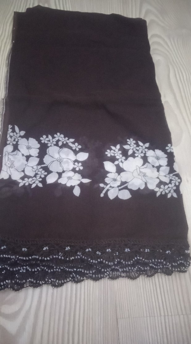 Koyu kahverengi tekstil şal, beyaz çiçek desenleri ve dantel detaylarıyla bohem tarzını yansıtıyor. hiç kullanılmamış