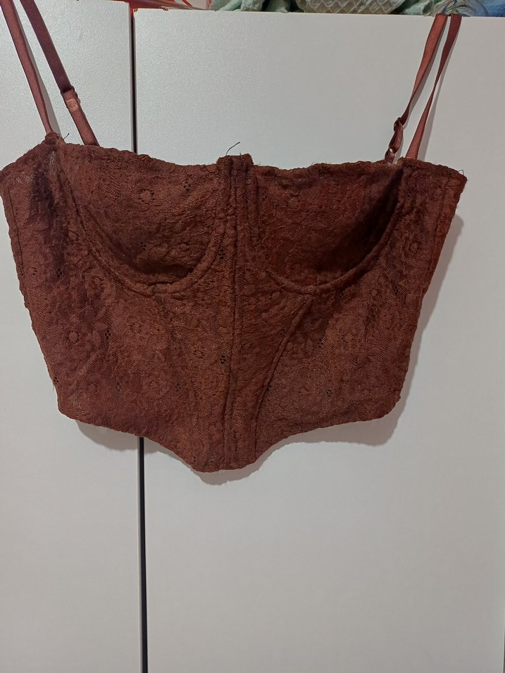 Dantel detaylı, kahverengi deri ve ince askılı straplez büstiyer. Koyu renk ve vintage tarzıyla bohem ve retro bir görünüm sunar. hiç giymedim