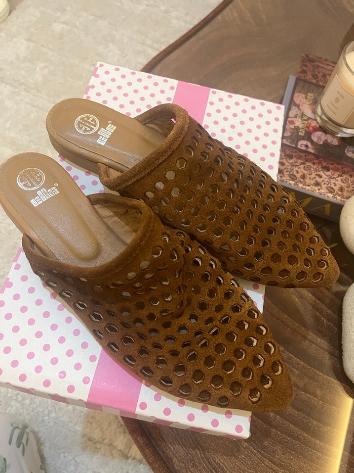 Kahverengi, dantel detaylı ve puantiyeli delik desenli dolgu topuklu kadın terlik, parlak görünüme sahip. Bohem tarzına uygun.