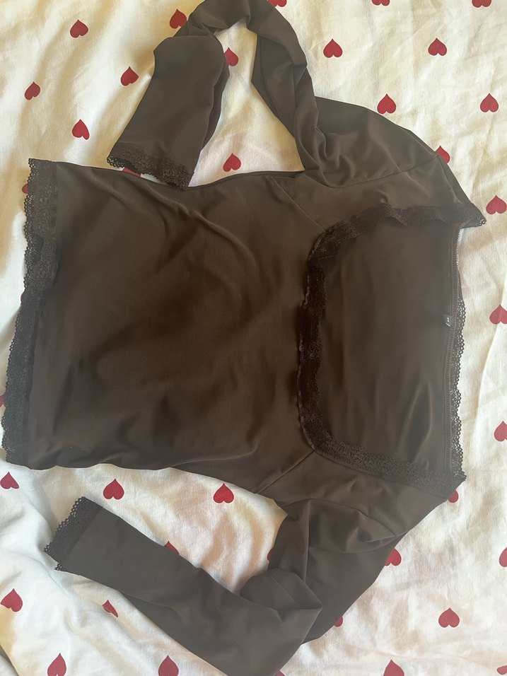 Kahverengi, uzun kollu, V yakalı, dantelli ve ipeksi kumaştan gotik tarzda, romantik akşamlar için uygun dar kesim kadın bluz.