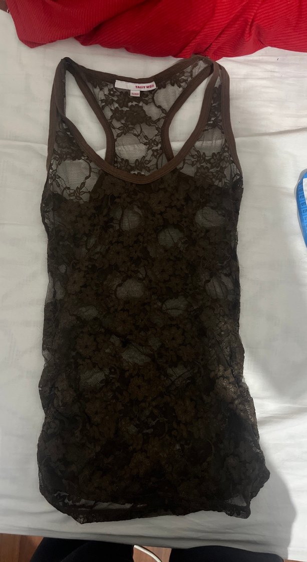 Kahverengi, dantel kumaştan, ince askılı ve straplez yaka detaylı, bohem gotik tarzda, vücuda oturan atlet. Günlük kullanım için uygundur. esniyor baya beli sariyor defosunu belli ettim