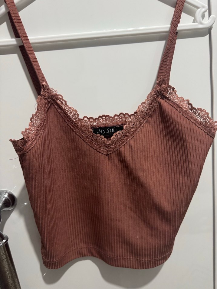 İnce askılı, V yaka ve dantel detaylı kahverengi atlet, yumuşak ve parlak kumaştan yapılmıştır. Günlük kullanıma uygundur.