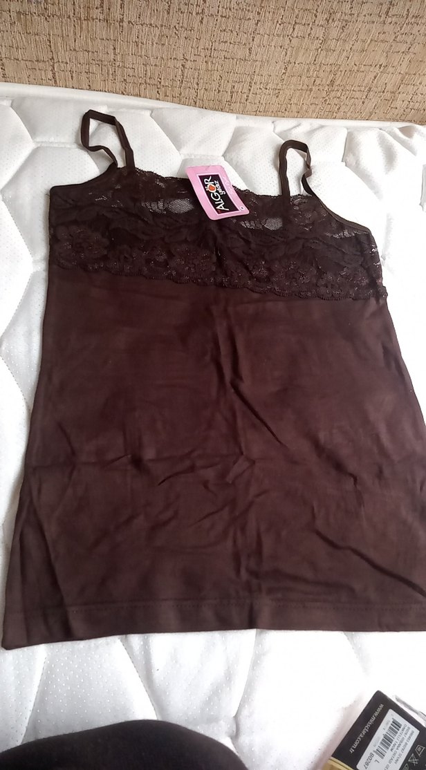 Bu kahverengi kadın atlet, göğüs kısmında dantel detayları ve ince askılarla tasarlanmıştır. İnce kesimi ve satenimsi kumaşıyla günlük kullanıma uygundur.