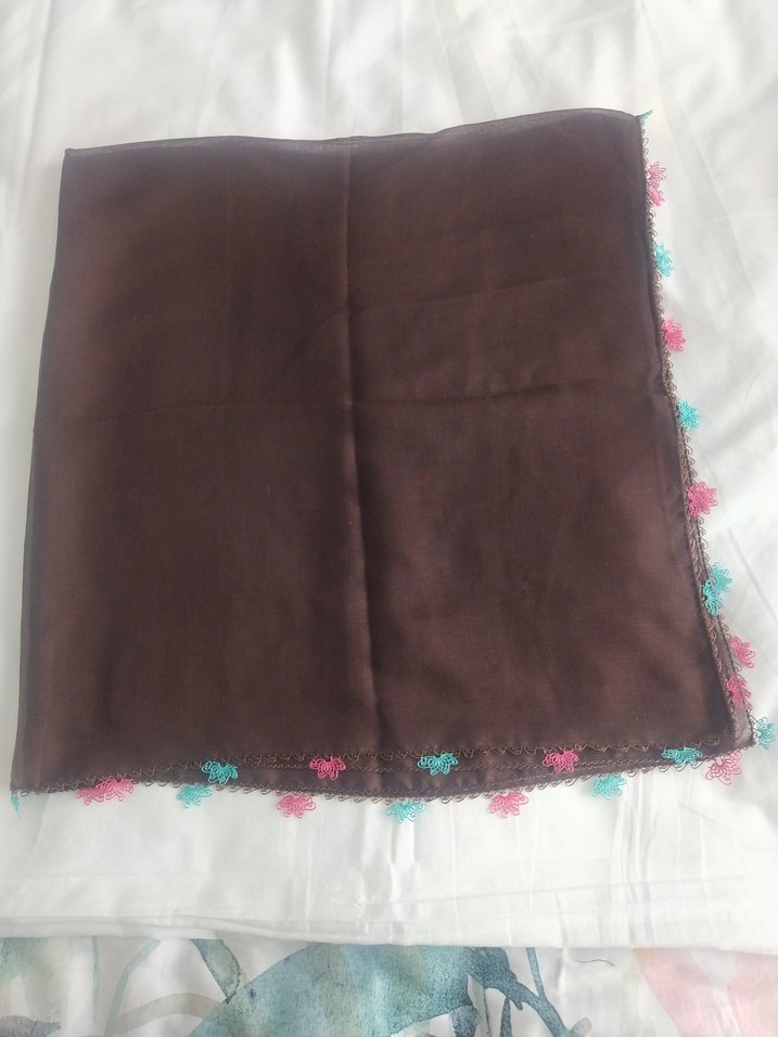 Kahverengi kadın fular, dantel detaylı ve yumuşak sentetik kumaştan, bohem tarzına uygun. iğne oyası yazma iki kenar