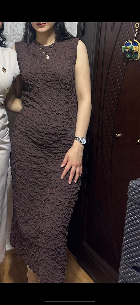 Yüksek yakalı, dantelli ve kolsuz kahverengi midi hamile elbisesi. Dokulu keten kumaştan, şık ve rahat bir görünüm sunar.