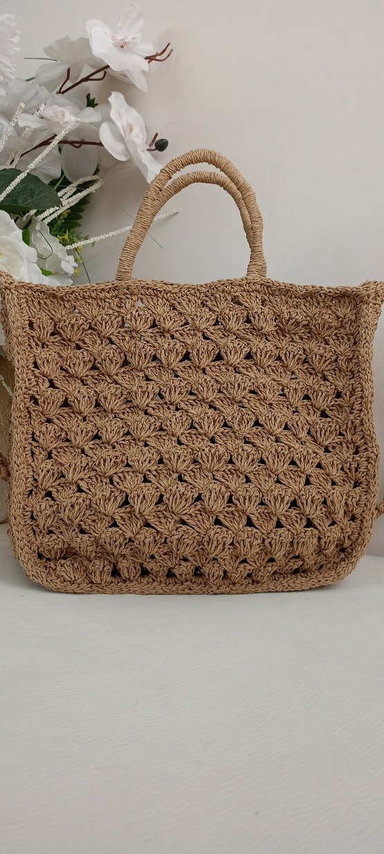Hafif kahverengi örgüden yapılmış, dantel işlemeli ve bohem tarzda günlük kullanıma uygun kadın çantası.
