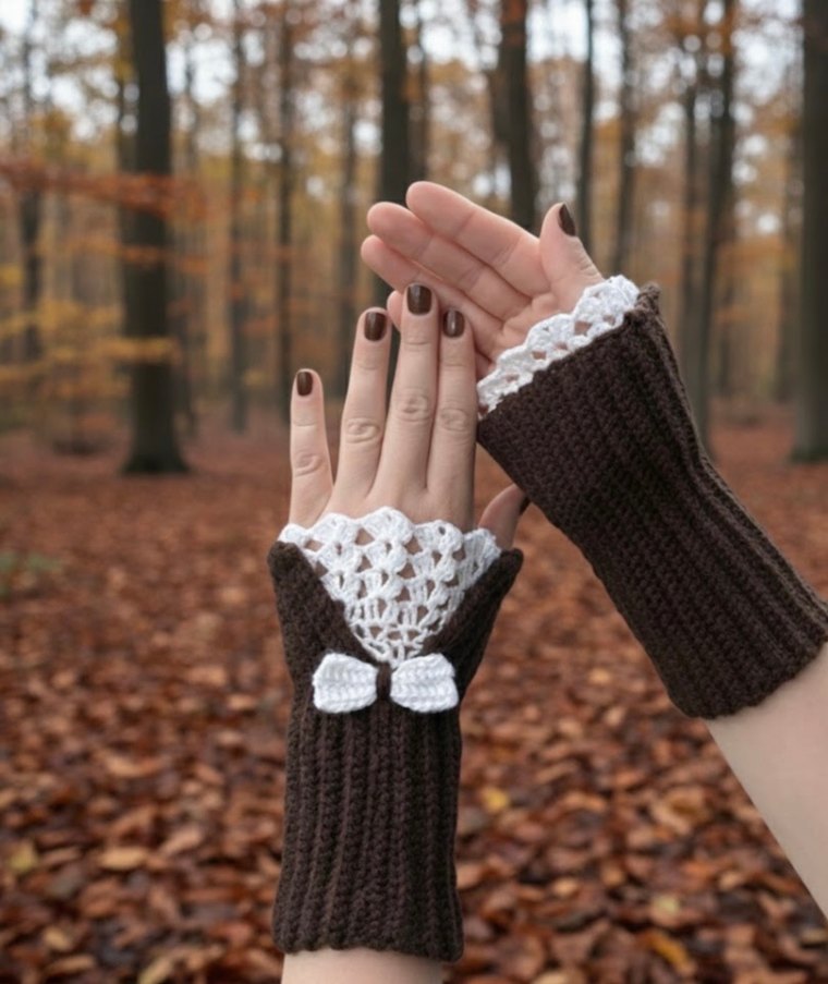 Koyu kahverengi örgü eldivenler, beyaz dantel manşetler ve küçük fiyonk detayıyla rahat ve gotik tarzı birleştirir.