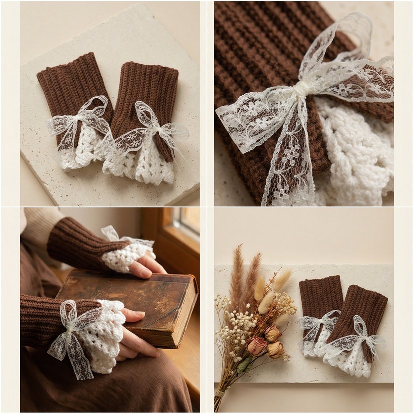 Kahverengi, dantel detaylı örgü eldivenler, rahat ve bohem tarzda. Yumuşak ve sıcak tutar, serin havalar için uygun.