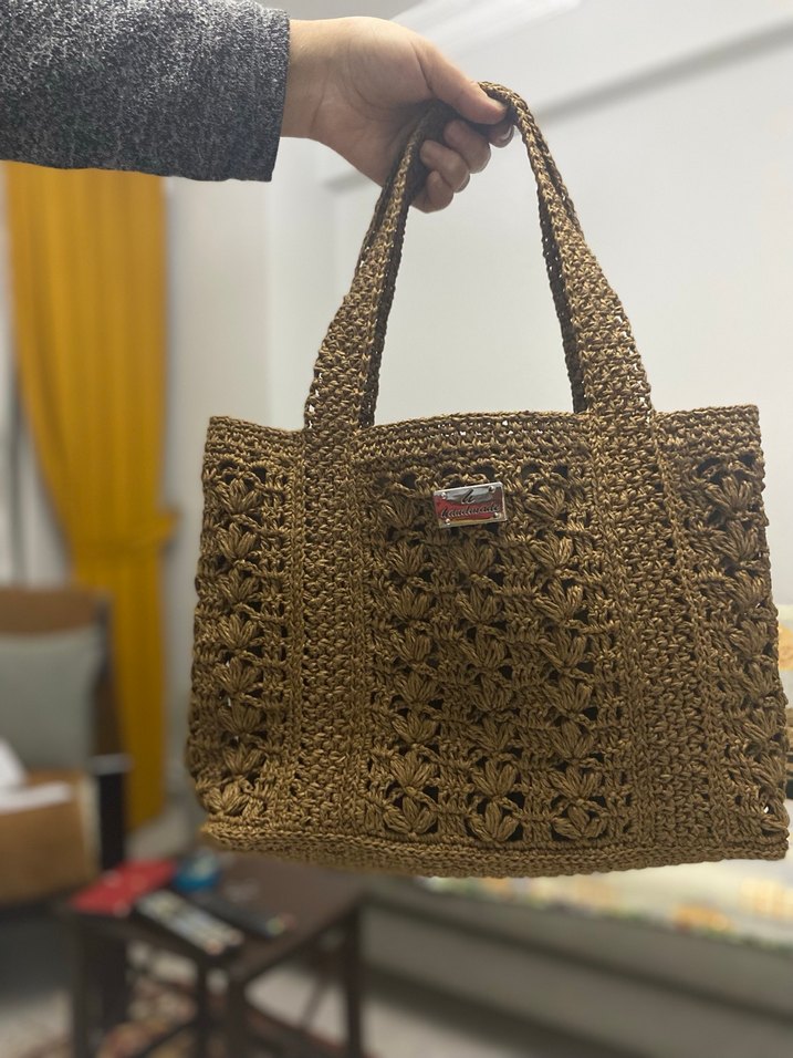 Açık kahverengi örgü çanta, dantel detayları ve bohem stiliyle günlük kullanım için uygun, retro ve hippie havası taşıyor.