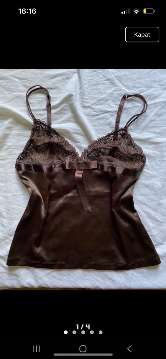 Dantel detaylı, saten kahverengi kumaştan, V yakalı ve askılı, normal midi uzunlukta, oturan kesim bustiyer. Cesur gotik tarz için uygundur.