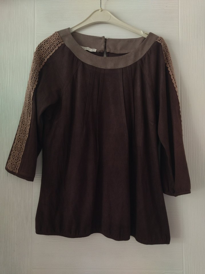 Kahverengi süet kumaştan, yuvarlak yaka ve uzun kollu kadın bluz. Omuzlarda dantel detayları bulunur. Salaş kesim ve normal boyda, bohem tarzda günlük kullanım için uygun.
