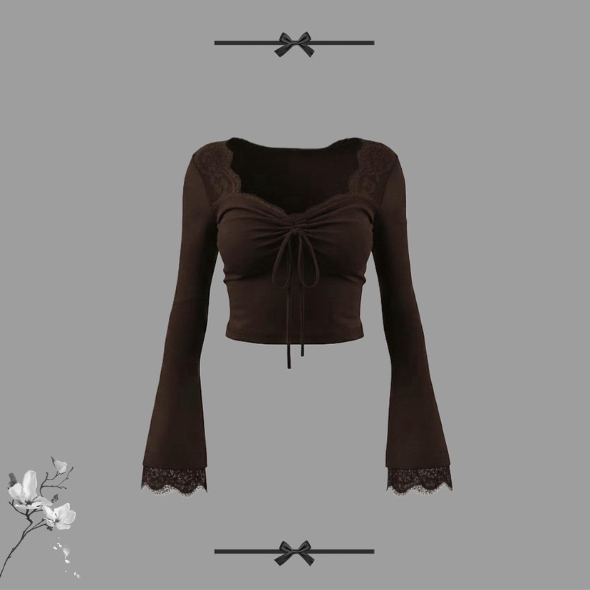 Kahverengi, dantel detaylı, uzun kollu, V yakalı ve bağcıklı, bohem ve gotik tarzı yansıtan, vücuda oturan bluz.