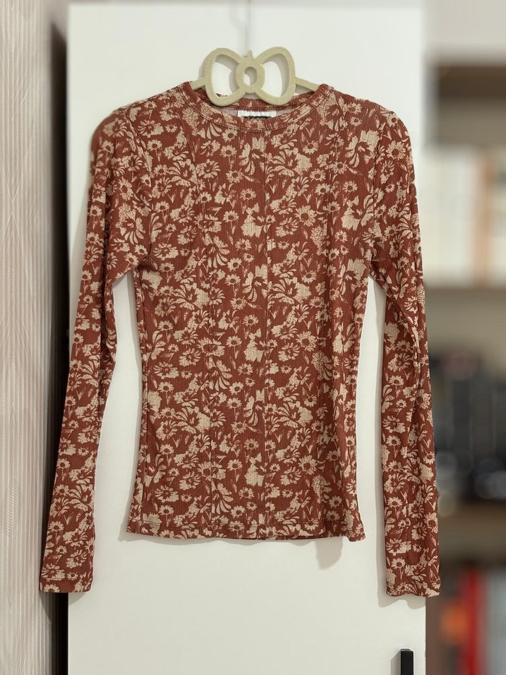 Dantel detaylı, uzun kollu, kahverengi ve çiçek desenli bu bluz, bohem tarzı ve yumuşak sentetik kumaşıyla günlük kullanıma uygundur.
