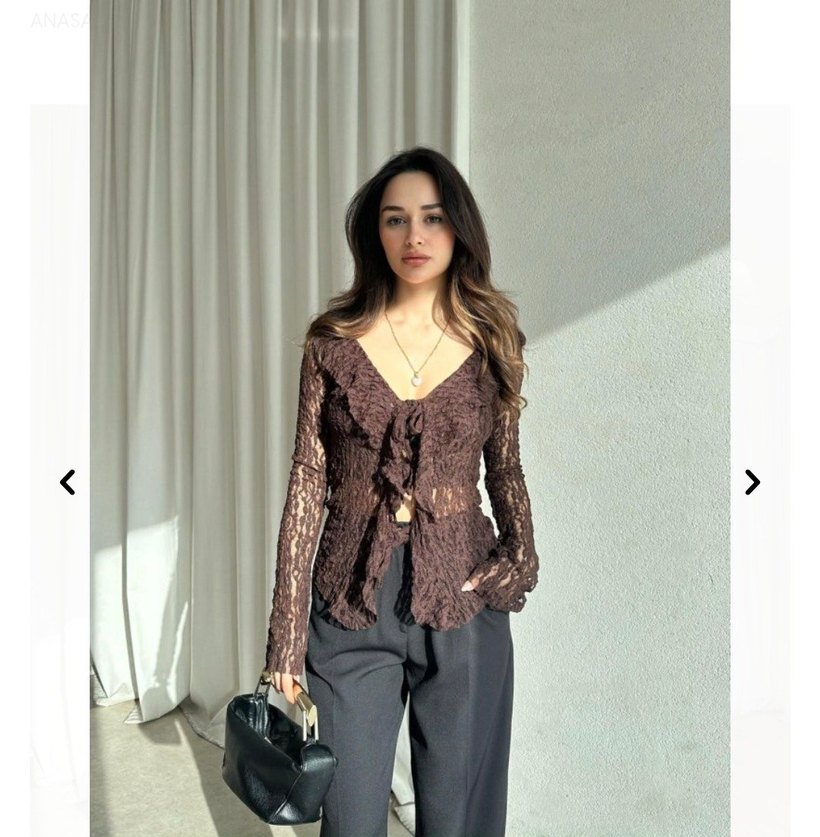 Kahverengi triko bluz, uzun kollu ve V yaka. Dantel detaylı ve yılan desenli, rahat kesim, ofis için uygun.