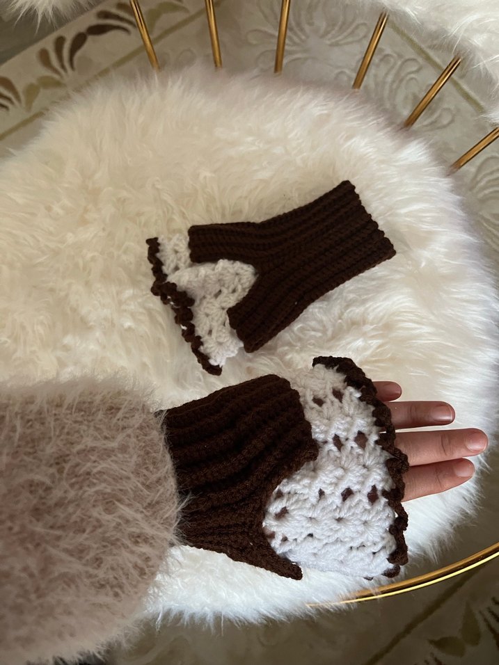 Kahverengi örgü eldivenler, dantel detaylıdır ve yarım parmak yapısıyla bohem ve retro tarzı sunar. Serin havalar için rahat ve sıcaktır. Sipariş üzerine yapılır