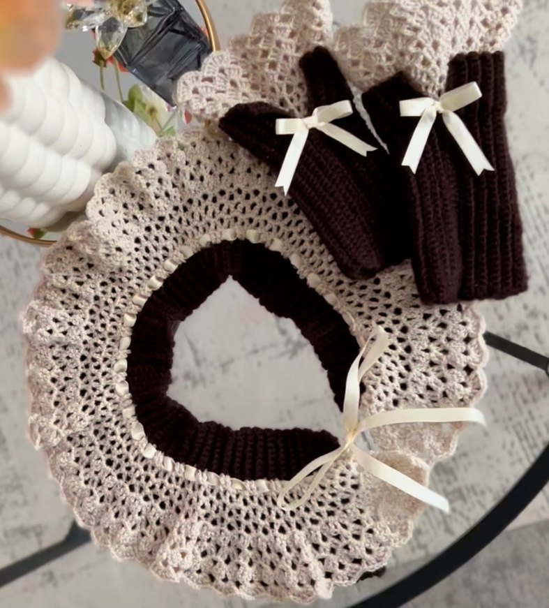 Dantel Detaylı Kahverengi vintage Yaka ve eldiven