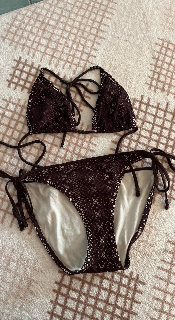 Bohem tarzda, kahverengi yılan desenli, dantel detaylı ve strappy askılı, vücuda oturan bikini. ️
