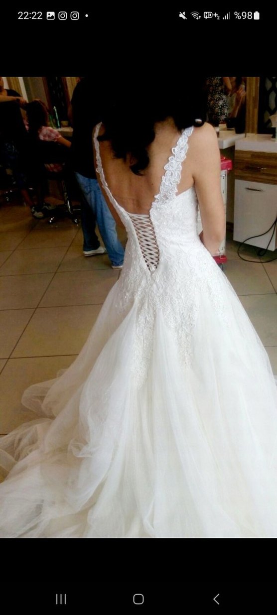 kirik Beyaz renkli, dantel askılı ve kalp yakalı, vintage tarzda uzun ve A kesim gelinlik. Sırt kısmında bağcıklı detay bulunur. Klassik şıklık sunar. relactive marka