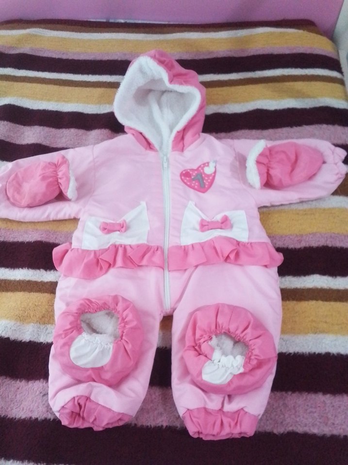 Kapüşonlu yakalı, dantel detaylı pembe bebek tulumu. Nakışlı desenleri ve pastel renk tonuyla sıcak tutar. ❄️