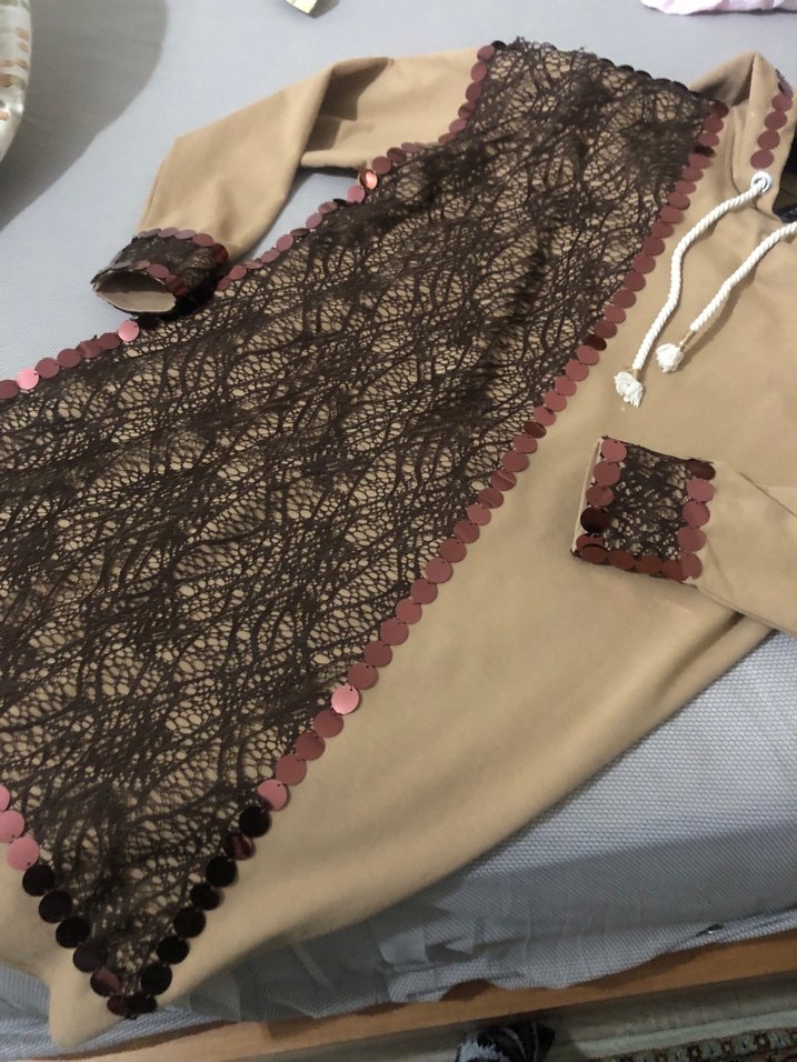 Kapüşonlu, uzun kollu kahverengi tunik, dantel ve nakış detaylarıyla bohem tarzda, bol kesimdir. Günlük kullanım için uygundur. 2 kere kullanıldı hiç bir deforme yok elbise olarakda kullanılabilir