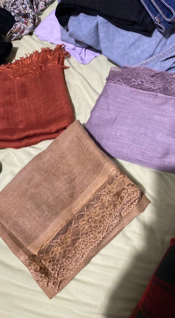 Yumuşak keten kumaştan, dantel detaylı bohem kadın şalları. Kahverengi ve mor tonlarında, doğal ve rahat bir görünüm sunar.