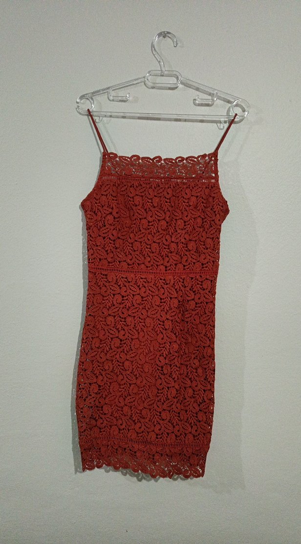 Kiremit renginde dantel işlemeli, ince askılı, vücuda oturan midi boy elbise.