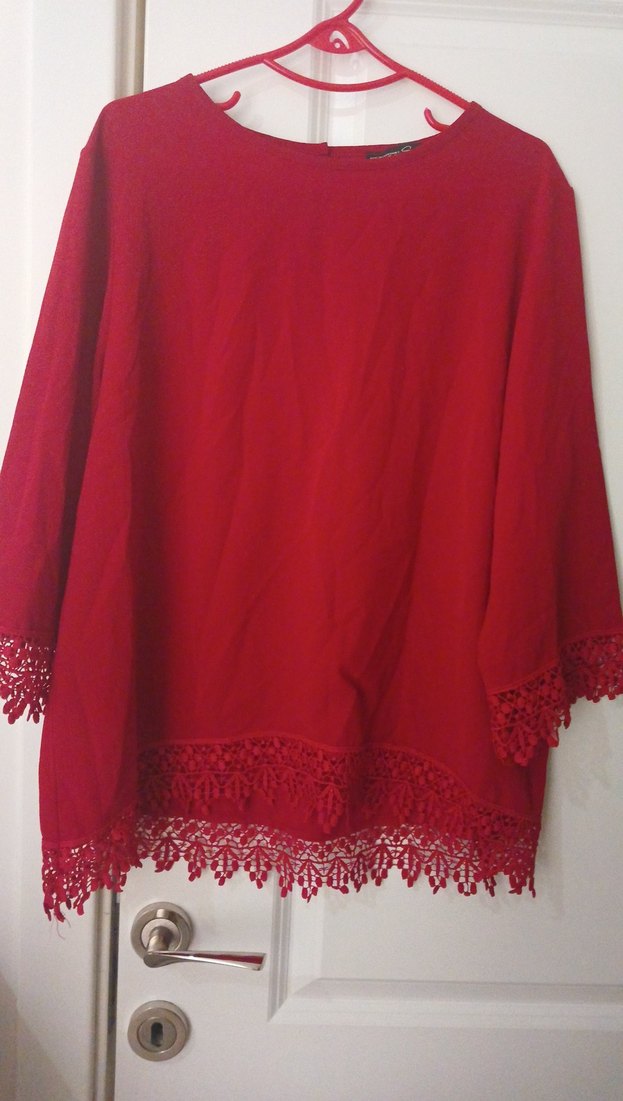 Kırmızı, uzun kollu, dantel detaylı ve salaş kesimli bohem bluz. Yuvarlak yakalı, parlak dokulu, romantik akşamlar için uygun.