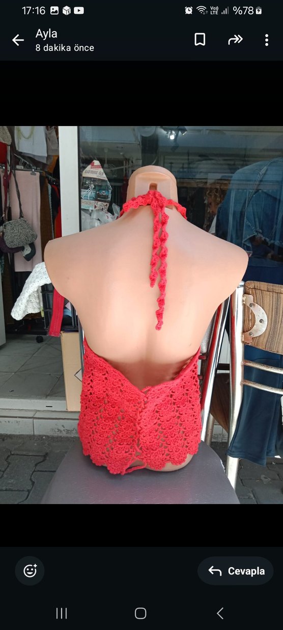 Kırmızı renkli, dantel detaylı ve halter yakalı bu sıkı oturan örme büstiyer, kısa boy ve kolsuz tasarımıyla bohem tarzını yansıtıyor.