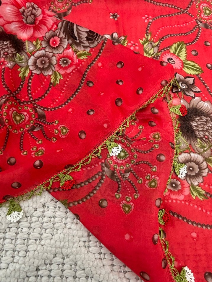 Canlı kırmızı renkte, dantel detaylı, çiçek ve zincir desenli bohem tarzı kadın fuları.