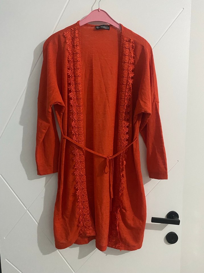 Kırmızı renkli, uzun kollu, V yaka, nakışlı dantel detaylı, bağcıklı, midi boy, bol kesim bohem kadın hırka.