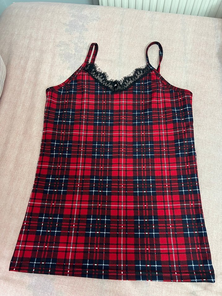 Dar kesim, koyu kırmızı ekose desenli bayan atlet, dantel detaylı ve ince askılı, sentetik kumaştan üretilmiştir. Rahat kullanım için uygundur. hiç giyilmedi