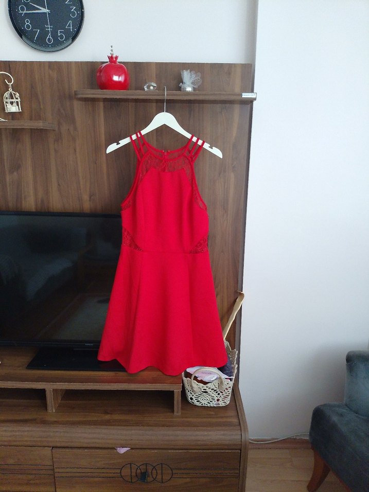 Kırmızı mini elbise, dantel detaylı ve askılı yakaya sahip, likrali kumaş orjinal Guess elbise.