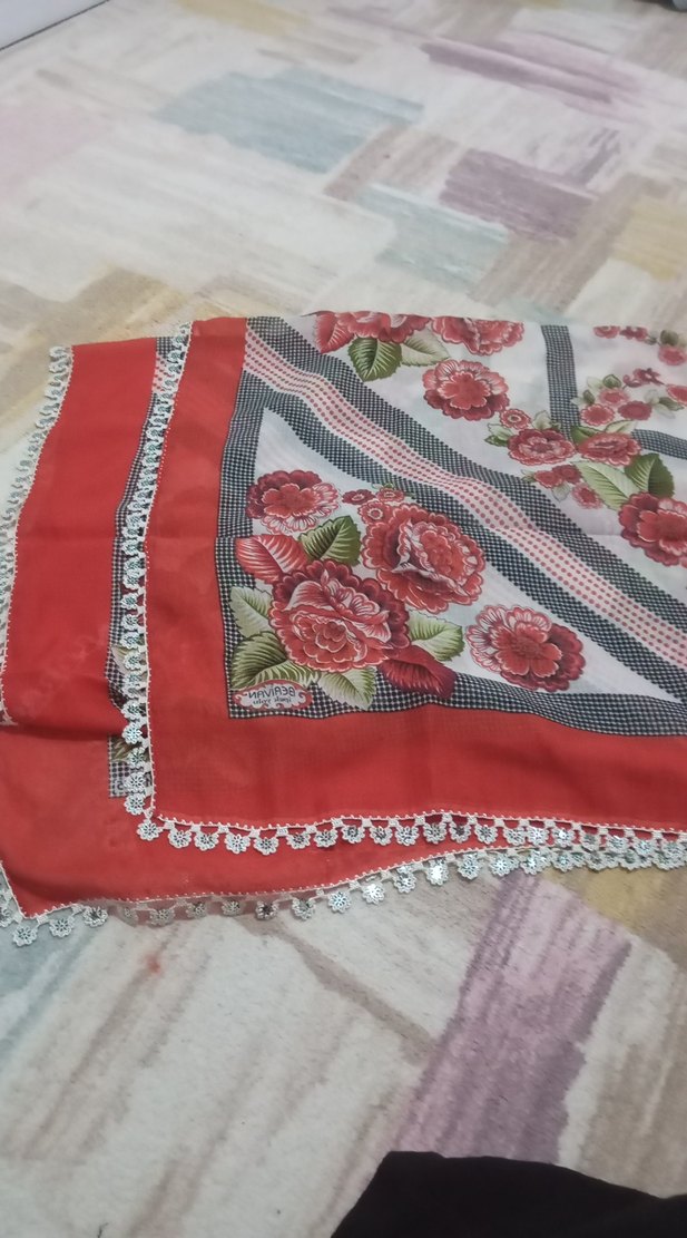 Kırmızı ve gri çiçek desenli, dantel detaylı kadın fular. Sentetik kumaştan, bohem ve retro tarzlara uygun klasik bir model.