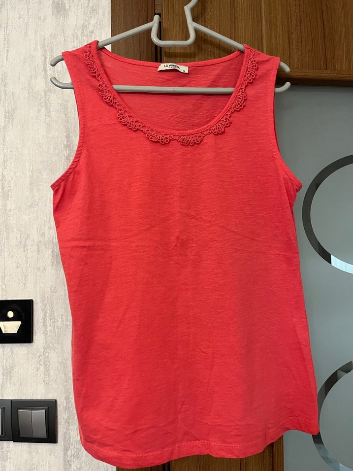 Kırmızı renkli, dantel detaylı yuvarlak yaka ve salaş kesim kadın atlet. Pamuklu kumaştan, rahat ve minimalist tarzda, günlük kullanıma uygun.