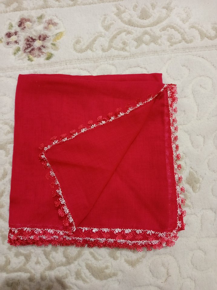 Yumuşak tekstil kumaştan yapılmış, kenarları dantel detaylı kırmızı kadın fular. Rahat ve renkli bir aksesuar olarak öne çıkar.tane fiyatı dir