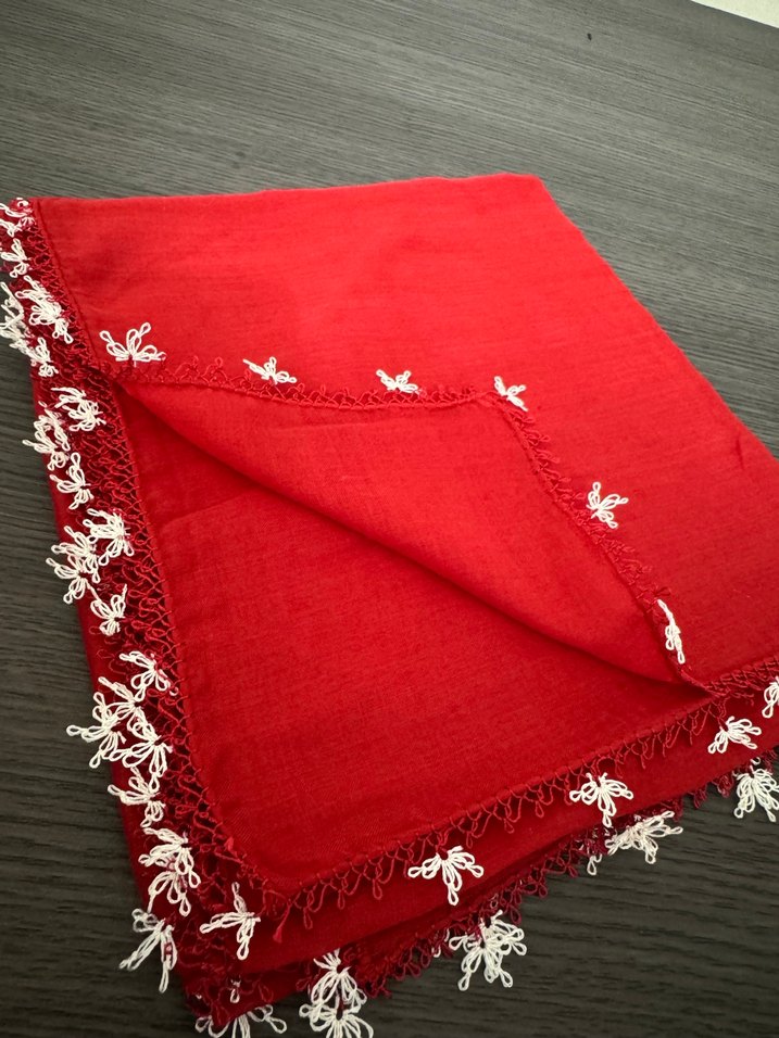 Kırmızı renkte, uçları beyaz dantel süslemeli kadın şalı. Tekstilden yapılmış, rahat ve sıcak bir dokunuş sağlar.