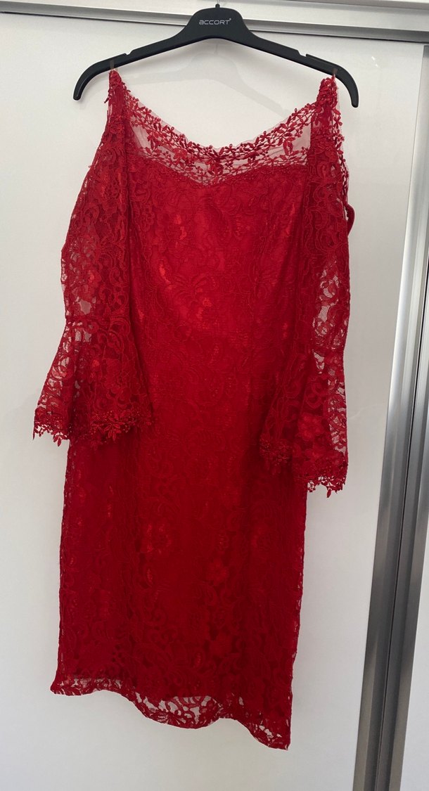 Kırmızı dantel detaylı, tek parça, gövdeyi saran midi elbise. Uzun kollu ve tekne yaka ile vintage ve bohem tarzda şık bir model.
