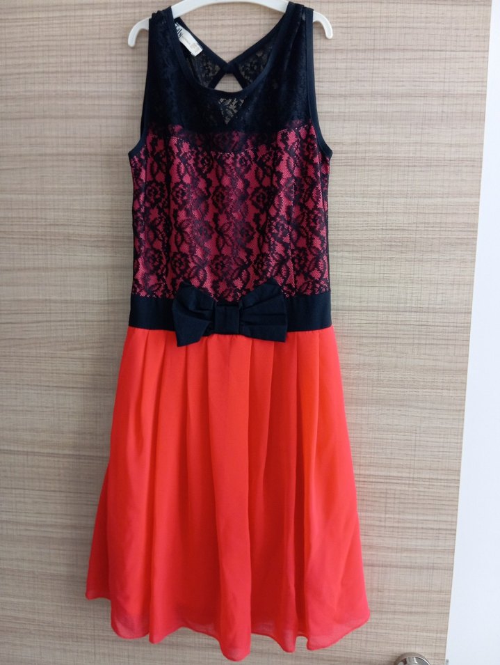 Kolsuz, siyah dantel üst ve kemerinde fiyonk detaylı, kırmızı renkli midi boy bol kesim elbise. Parti için uygundur.